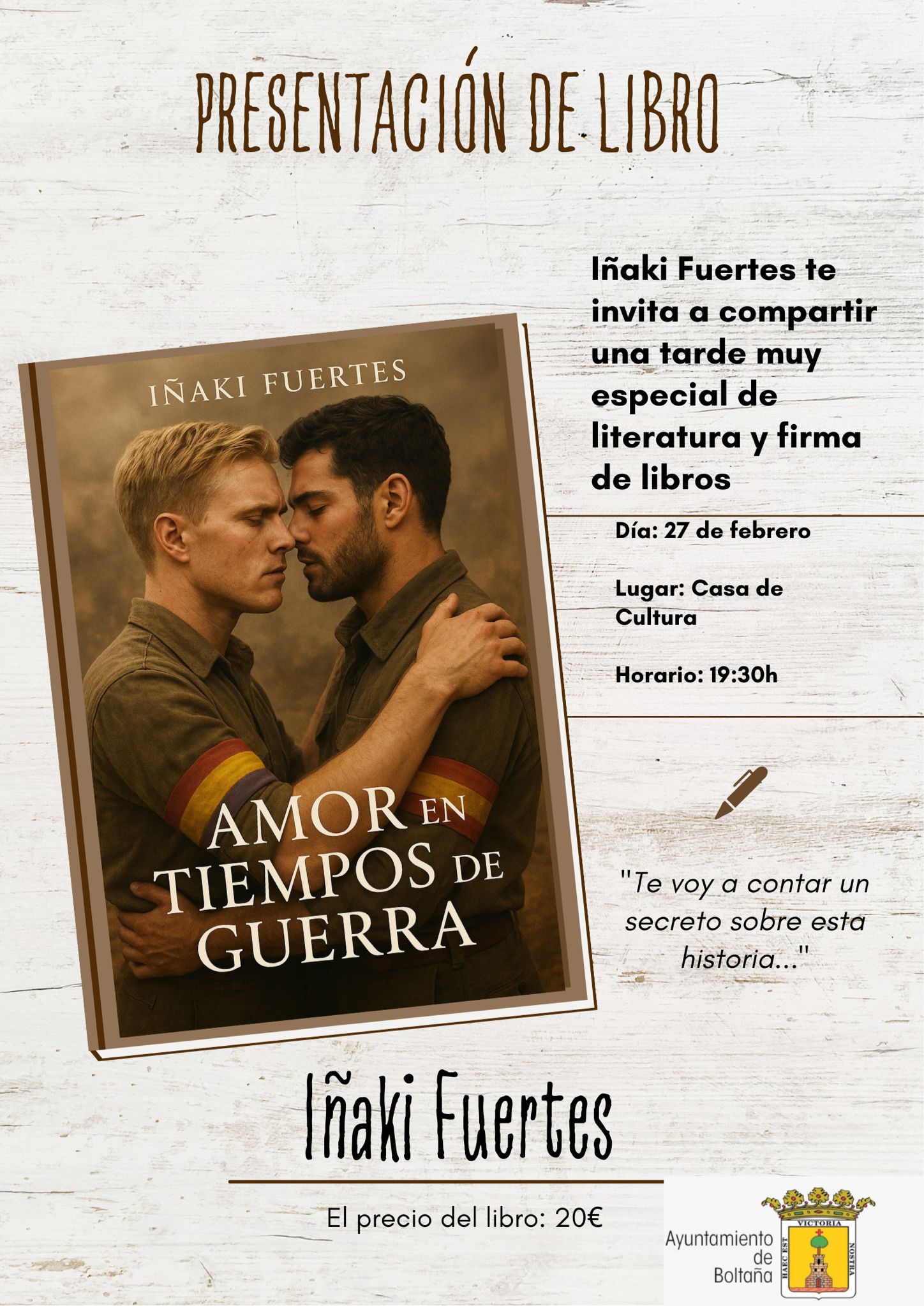Tendremos el placer de acoger a Iñaki Fuertes, que presentará su novela “Amor en tiempos de guerra” y compartirá con nosotros una conversación cercana sobre su obra… y sobre los secretos que guarda esta historia.